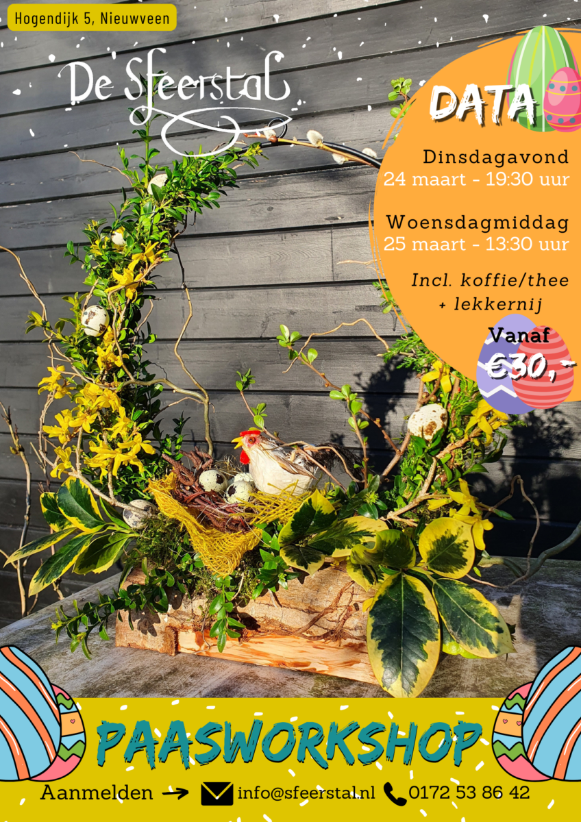 Reserveer een paasworkshop op dinsdag 24 maart of woensdag 25 maart 2026 en ga onder onze professionele begeleiding creatief aan de slag met verse en decoratieve materialen.